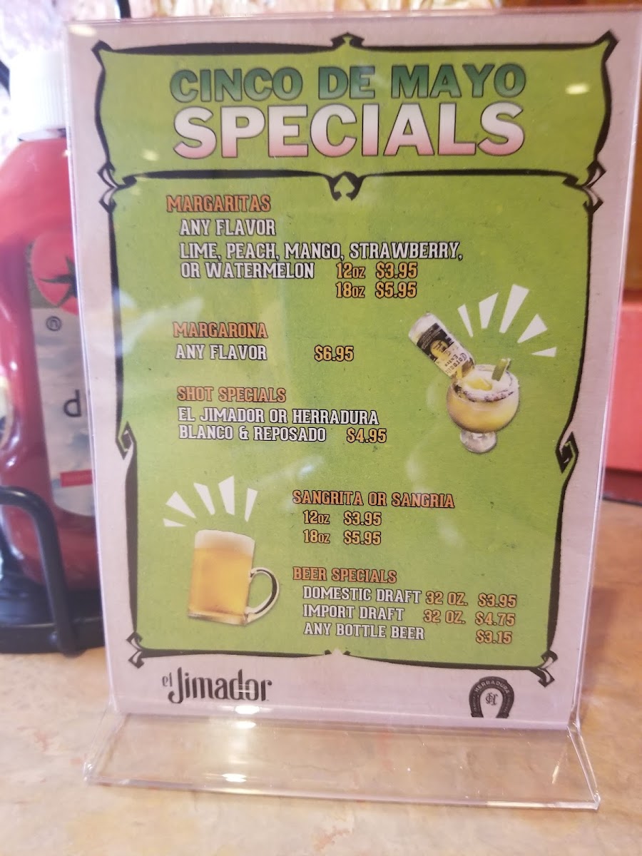 “ Great place for couples. There was no wait I had the streak group tacos with cheese and sour cream my girlfriend had the chicken cheese and rice with cheese sauce and chorizo we got our food fast and fresh and hot our waiter was very pleasant and nice very helpful with the menu all in all it was a great experience and time good, atmosphere to drink and relax ”